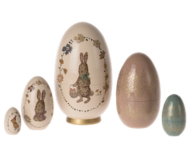This keepsake set consist of 5 wooden eggs in different sizes which are packed into each other. All eggs are beautifully decorated with special Maileg drawings.