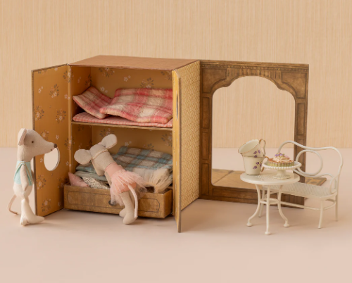 Open the doors of this magical box and explore a world of dance, stardust and storytelling. This set includes a sturdy cardboard box, that is both a dance studio and a cosy mouse house, as well as little sister mouse in her pretty pink ballerina outfit, with pink checked bedding and little brother in white ballet pants and blue top (he has blue checked bedding).