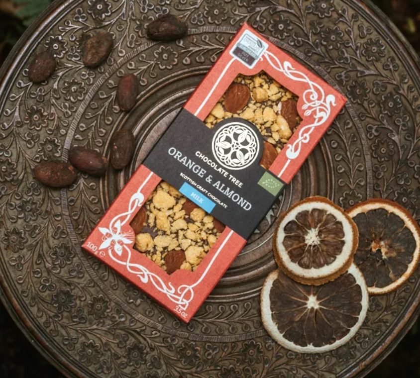 Italian inspired organic milk chocolate infused with orange oil and topped with natural orange pieces and roasted almonds.